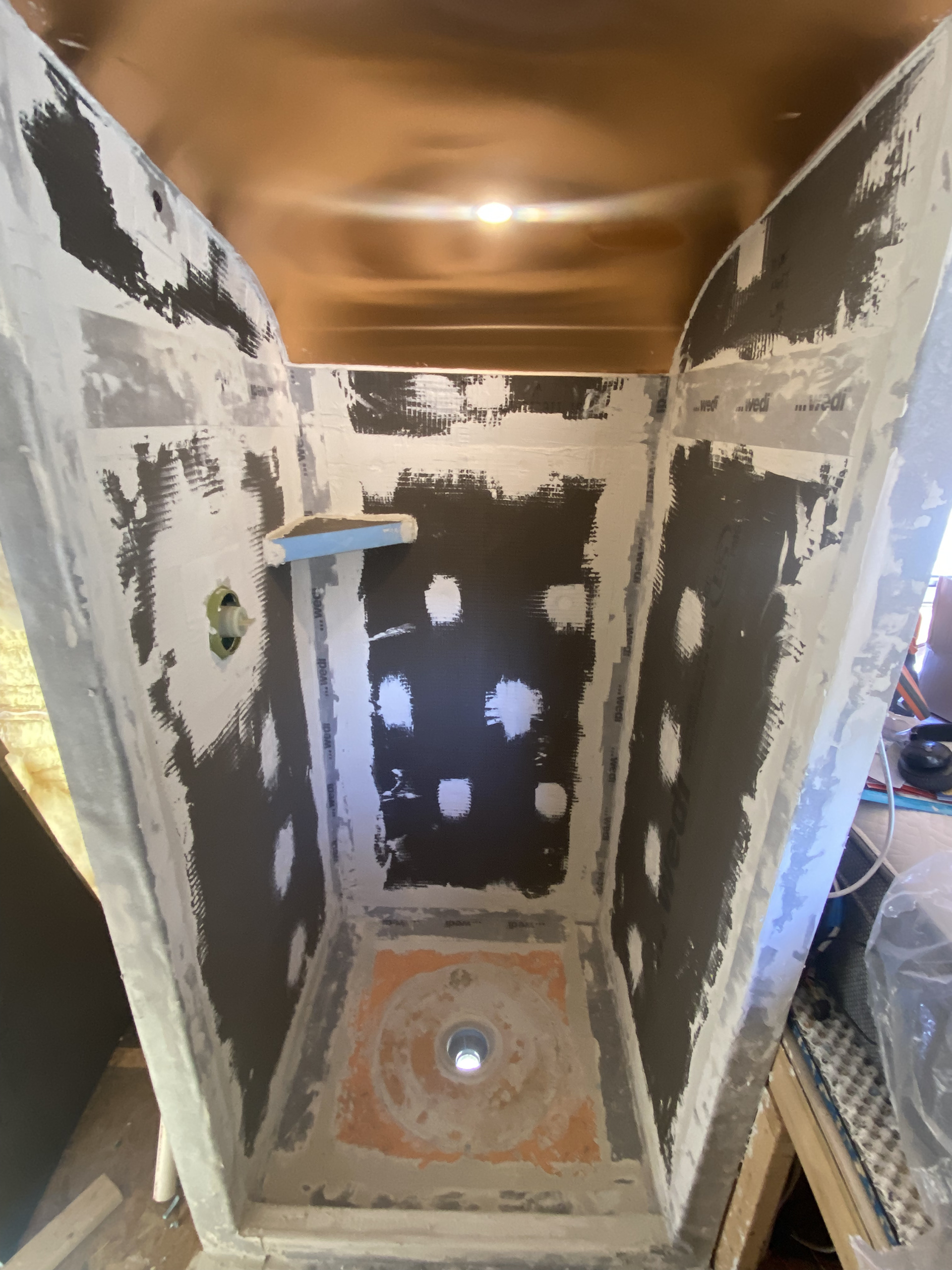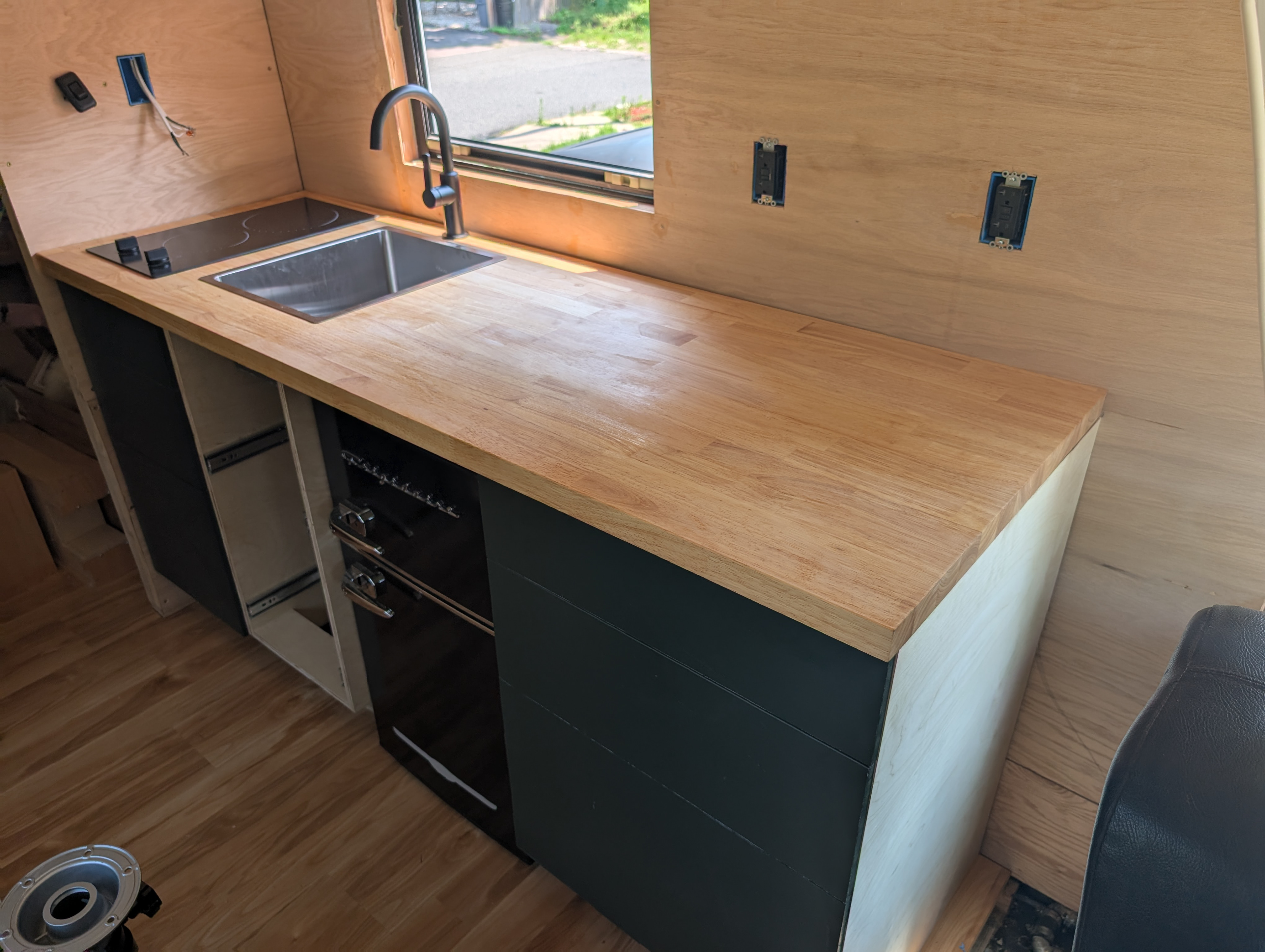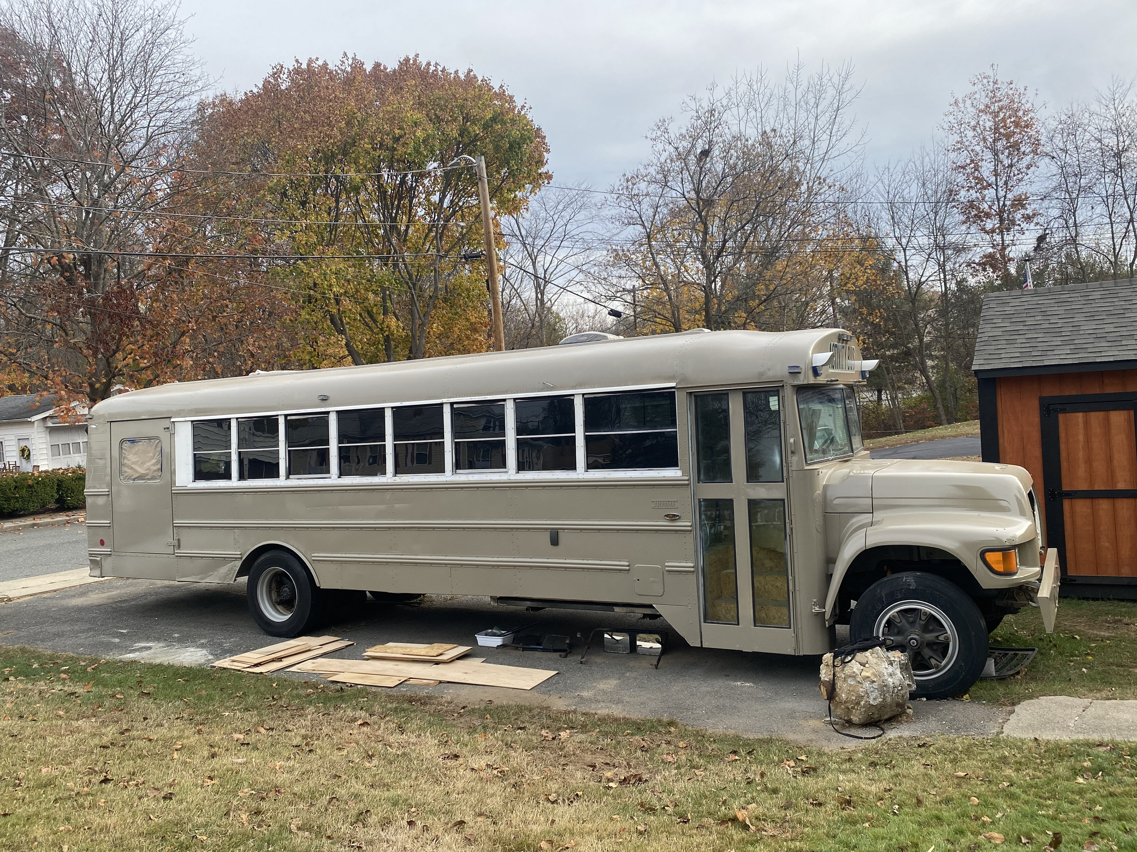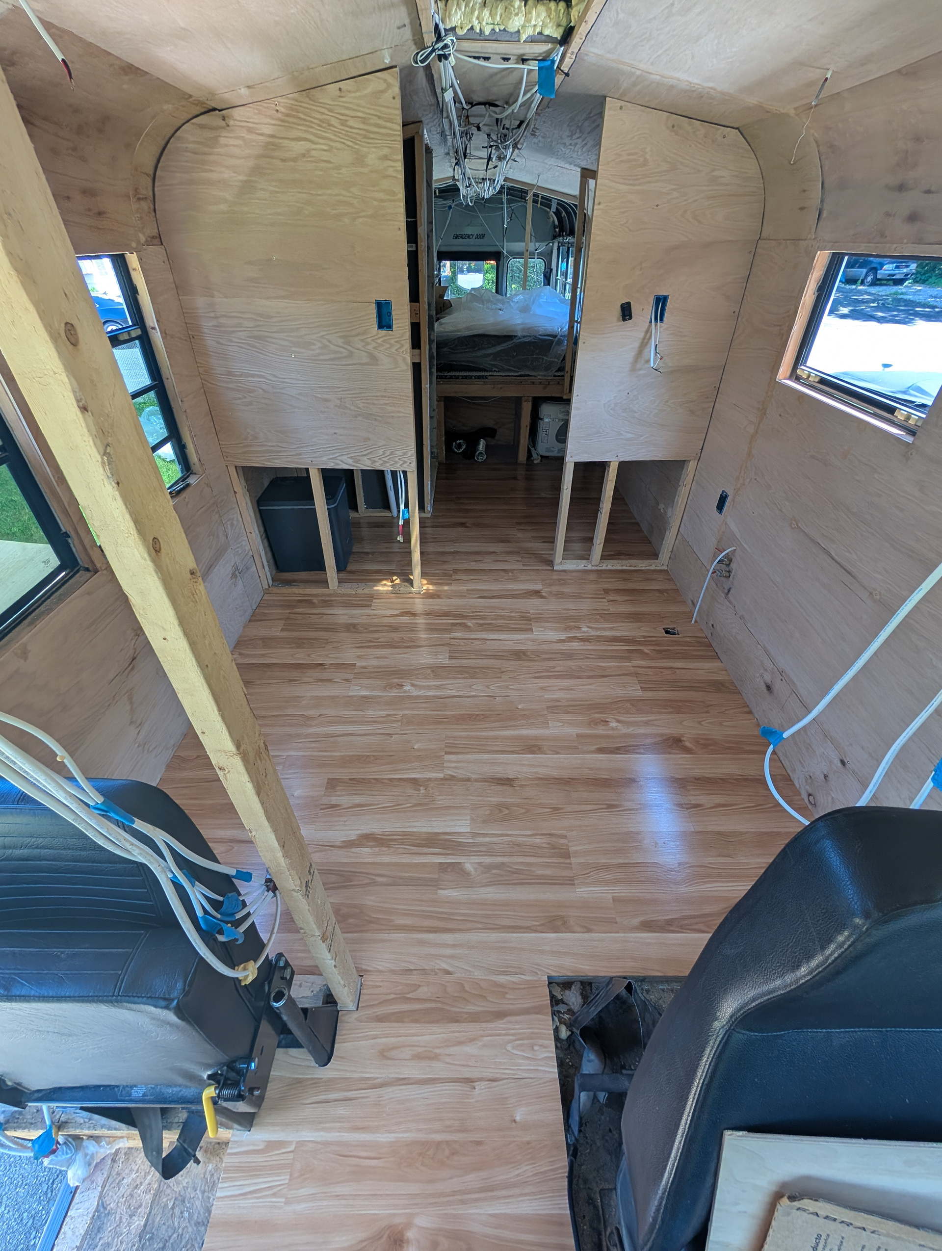 The first step was making the inside of the bus look less like a bus....a lot of demo. We ripped out all 18 seats, pulled out the rubber floors, and stripped the walls and ceilings of their metal sheeting. Once we thoroughly cleaned the metal shell we unveiled of gum lollipop sticks and pencils from 1997, we got to work putting in our insulation and subfloor. From there, we framed out the walls and ceilings, which involved an ungodly amount of wood to metal screws, and built the bed platform (as it houses many of our plumbing components). With framing in place, we designed and installed the components in our garage's electrical closet and subsequently ran all of our AC and DC lines to their respective lights, outlets, etc. Before the insulation goes in, we also had to rough in all of our plumbing, which meant hooking up our fresh water tank to our infill, pump, accumulator, and hot water heater and running PEX to each sink and shower. After spraying our closed-cell foam, we took to the walls, putting up sheathing on the exterior walls and ceilings and framing out interior walls. From there, we were able to rough in the shower, adding Wedi board and drain, as well as our kitchenette, the cabinetry for which I built out from scratch. With the faucet connected to our fresh water tank and sink drain connected to our grey water tank we have running water - a very exciting step. We also installed a mini split and condenser for AC in the summer (we'll use our diesel heater in the winter to save battery).
